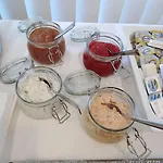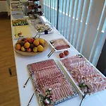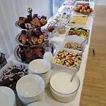 O pequeno-almoço extenso é servido na sala de jantar.